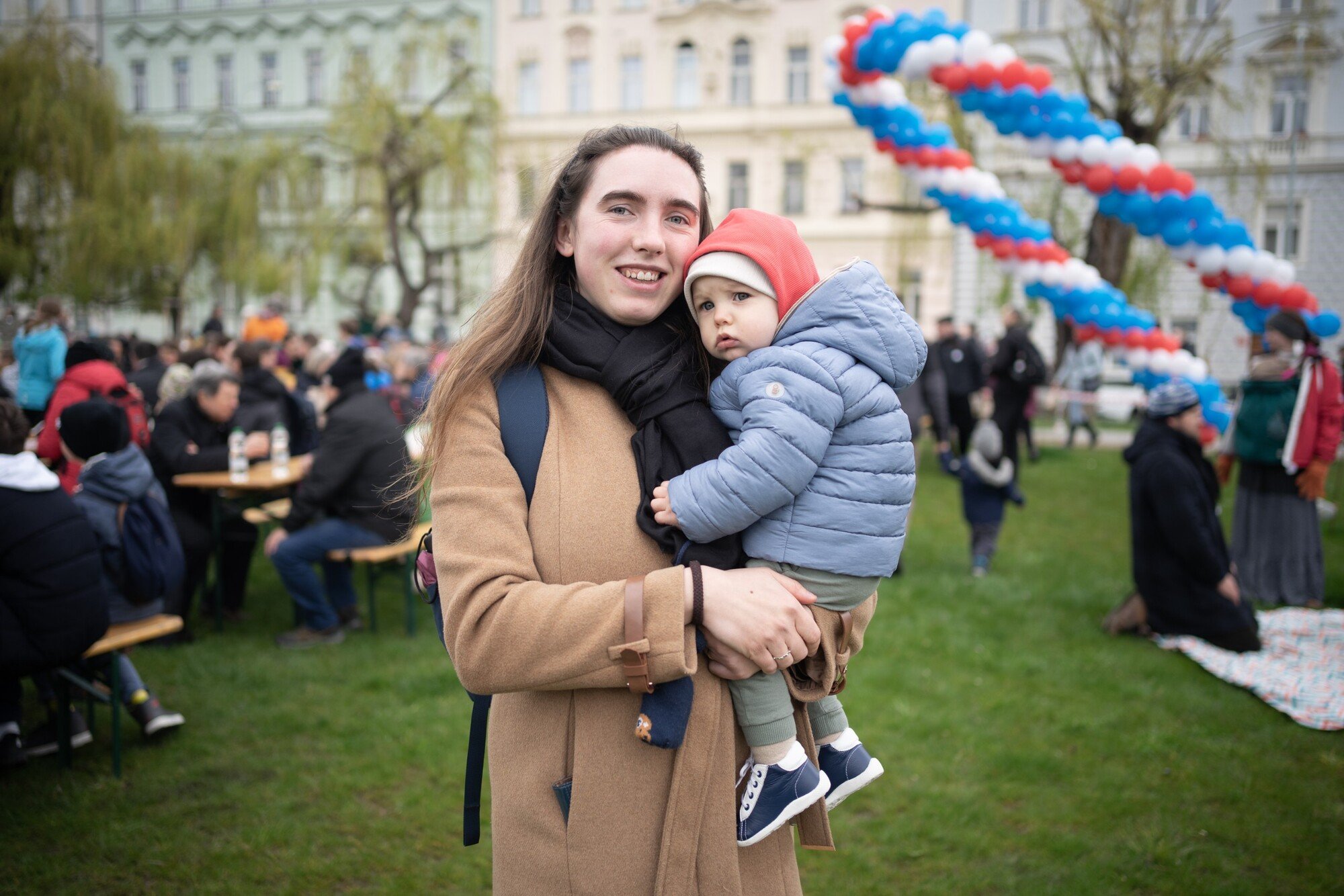Irena držící placku, kterou si kvůli fotografii sundala z klopy kabátu.